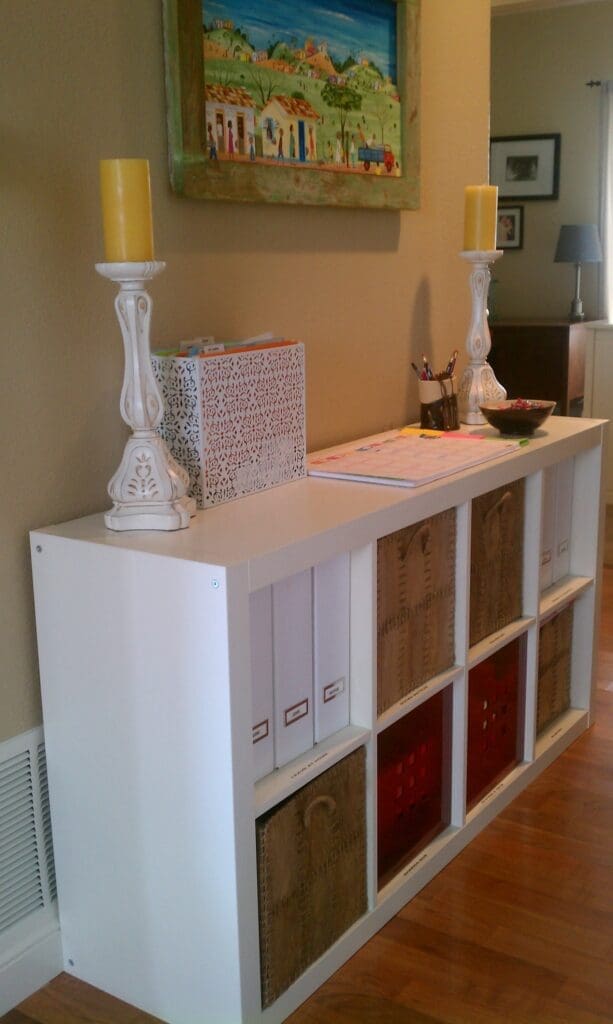 IKEA Expedit ($69.00) – can be used standing or sideways. If standing, you can use the side of it to install hooks for jackets and backpacks, as well as to hang your calendar and message board. It is a very versatile product that always looks good and delivers! The most versatile IKEA Product ever!